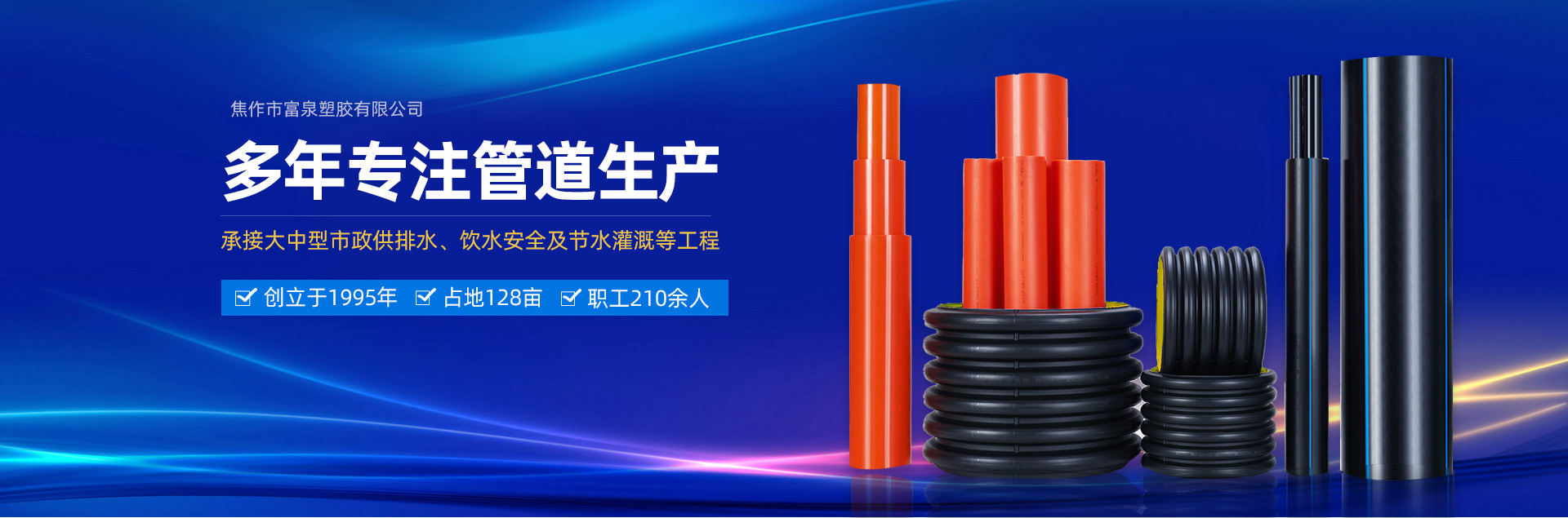 - 焦作市富泉塑膠有限公司,創立于1995年,是一家集研發、設計、生產、銷售為一體的大型管材企業。公司位于太極故里、黃河之濱一一河南焦作溫縣。公司占地128畝,現有職工210余人,其中具有中技術職稱的19人。生產、檢驗設備58臺(套),包括PVC實壁管生產線11套、PE實壁管生產線12套、HDPE雙壁波紋管生產線6套、PVC雙壁波紋管生產線5套,檢驗設備14臺(套)。主要產品有:Φ20mm-630mm、各種壓力規格的PVCU、PVC-M、PE給水管材,PVC-U節水灌溉管材,HDPE燃氣和礦用管材,DN200-800mm的HDPE、PVC雙壁波紋管及各種噴灌、滴灌工程材料。承接大中型市政供排水、飲水安全及節水灌溉等工程。 富泉塑膠公司重視產品的質量、安全、環保和節能,在同行業中率先完成了“新華節水產品認證”,全方面通過ISO9001:2008國際質量管理體系、IS014001:2004環境管理體系和OHSAS18001職業健康安全管理體系的一體化導入,并建立起規范的現代企業管理體系。公司以“質量”為先導,采用質量跟蹤、多環節把關的方法,組建具有行業水準的企業技術檢測中心,常年委托水利部節水灌溉設備檢測中心、河南省產品質量監督檢驗院對產品跟蹤檢測,并由中國人民保險公司承保產品質量。公司連續多年被河南省水利廳確定為“安全飲水設備、節水灌溉設備”定點生產企業,并獲得“中國名優產品”“質量、服務、信譽AAA企業”“河南省**產品”“河南省水利企業”“河南省守合同、重信用企業”等榮譽稱號。 富泉塑膠公司堅持“用戶為上”的服務理念,長期以來,全方面關注客戶價值,不斷提升服務水平。服務隊伍常年為客戶的產品設計、施工、安裝提供合理的方案和全程細致、周到、**、快捷的技術服務。公司自成立以來,一直堅持以人為本的宗旨,塑造企業形象,并致力于新產品的開發,憑借雄厚的技術開發能力,先進的工藝制造流程,嚴格的質量管理保證體系,優良的售后服務網絡,已成為河南省大的飲水、灌溉及排水管材設備制造商。產品暢銷全國,而且還以公司雄厚的綜合實力在業界中占據著重要的地位。
